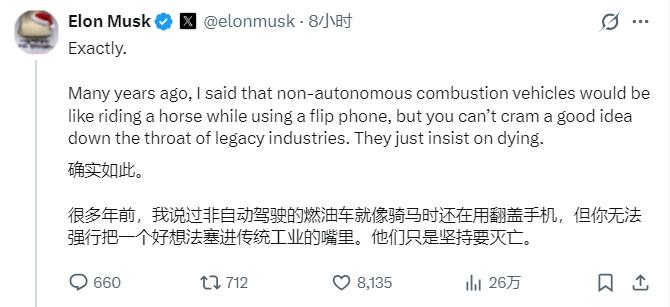 马斯克当时还出言嘲讽福特,认为这是“自作孽不可活”。因为在自动驾驶时代,内燃机的运营成本将完全不可持续。