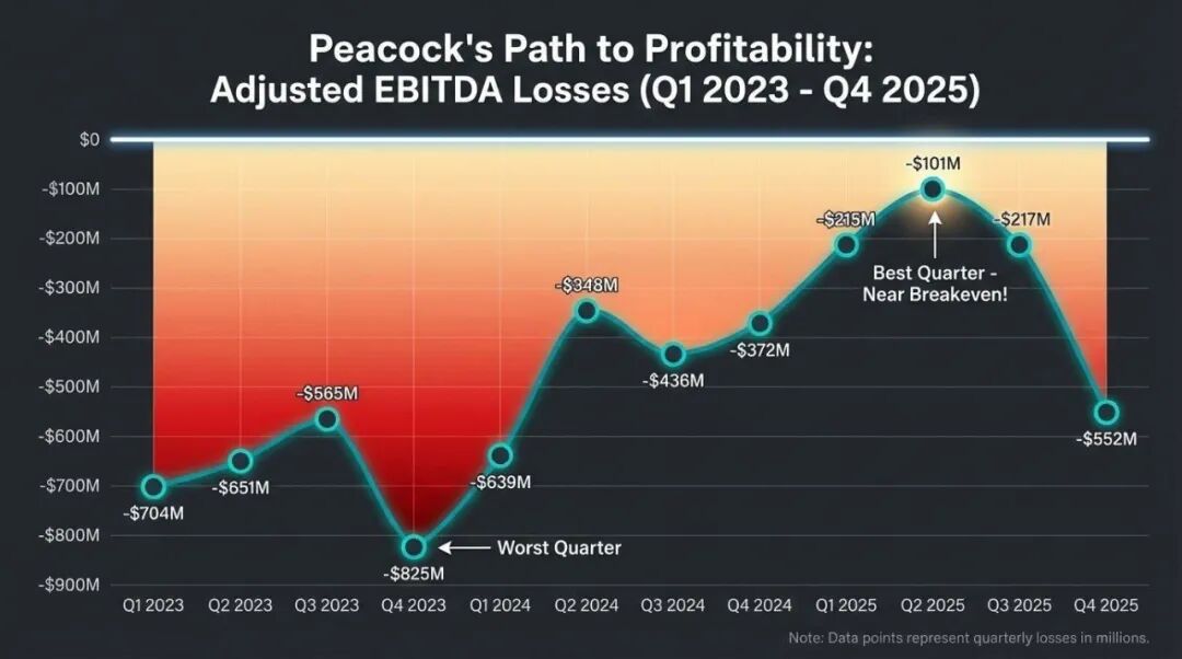 截至2025年底,Peacock拥有约4400万订阅用户,较前一季度增加了300万人;全年营收16亿美元,调整后亏损仍高达5.52亿美元。尽管NBC说广告与订阅收入均实现增长,但亏损幅度的扩大,让Peacock继续承压。
