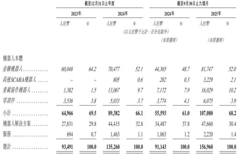 具体来看,2023年、2024年、2025年1-9月(简称“报告期”),公司60%以上的收入来自机器人本体,其中并联机器人贡献了约5成收入,占比较大;机器人解决方案的收入占比在30%左右。