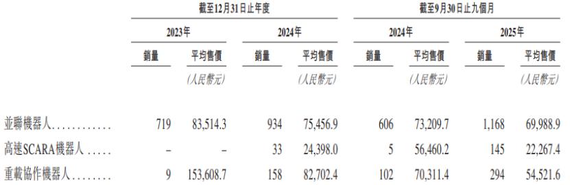公司部分机器人产品的销量及平均售价,图片来源于招股书
