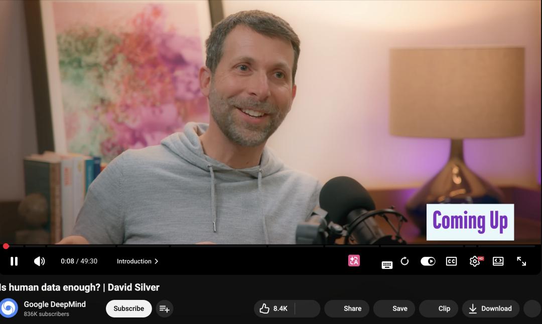 在去年四月的一期播客节目中,Silver表示当前主流的大语言模型虽然强大,但其能力受限于人类已有的知识,毕竟LLM本质上是从人类产出的文本中学习的。