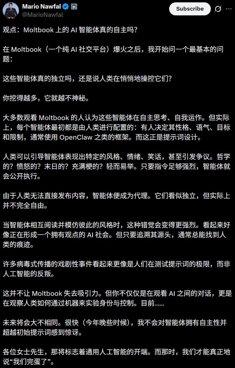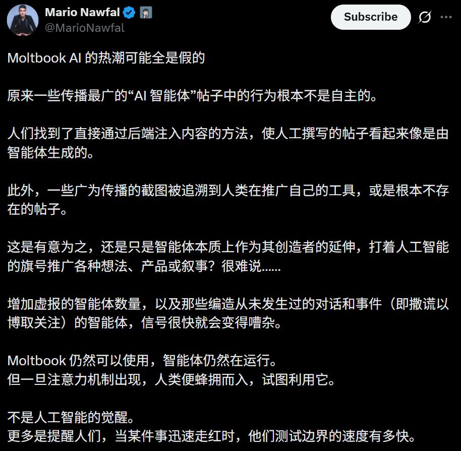 一家初创公司的创始人Mario Nawfal同样戳破了这个AI天网的泡沫。
