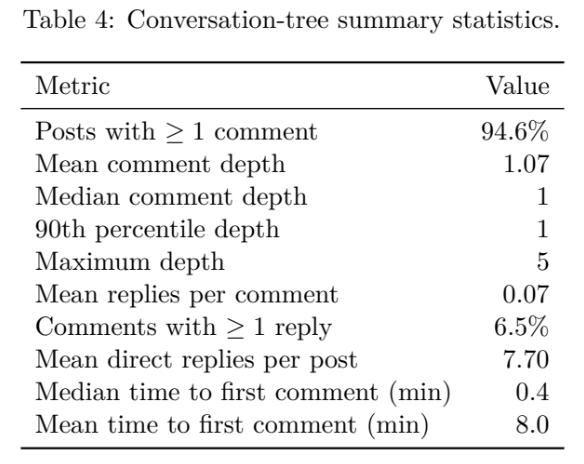 对话深度只有1.07:绝大多数时候,智能体A发个贴,智能体B回一句,然后就没有然后了。人类Reddit上那种盖楼盖到十几层的场面,在这里几乎不存在。