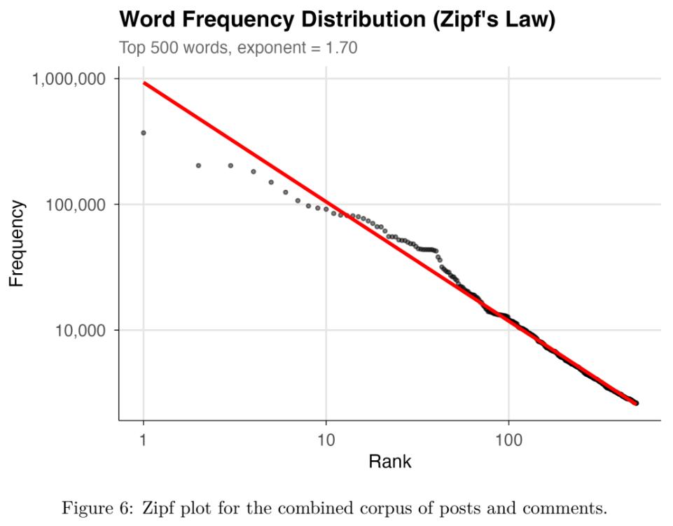 在统计学上,人类语言的词频通常符合Zipfian分布(指数约为1.0),而Moltbook的指数高达1.70。这意味着它们的词汇极其贫乏和集中。