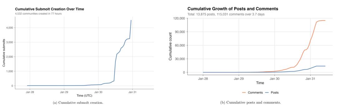 研究者David Holtz抓取了Moltbook上线头3.5天的数据(包含6,159个智能体、13,875个帖子和115,031条评论),试图回答一个核心问题: