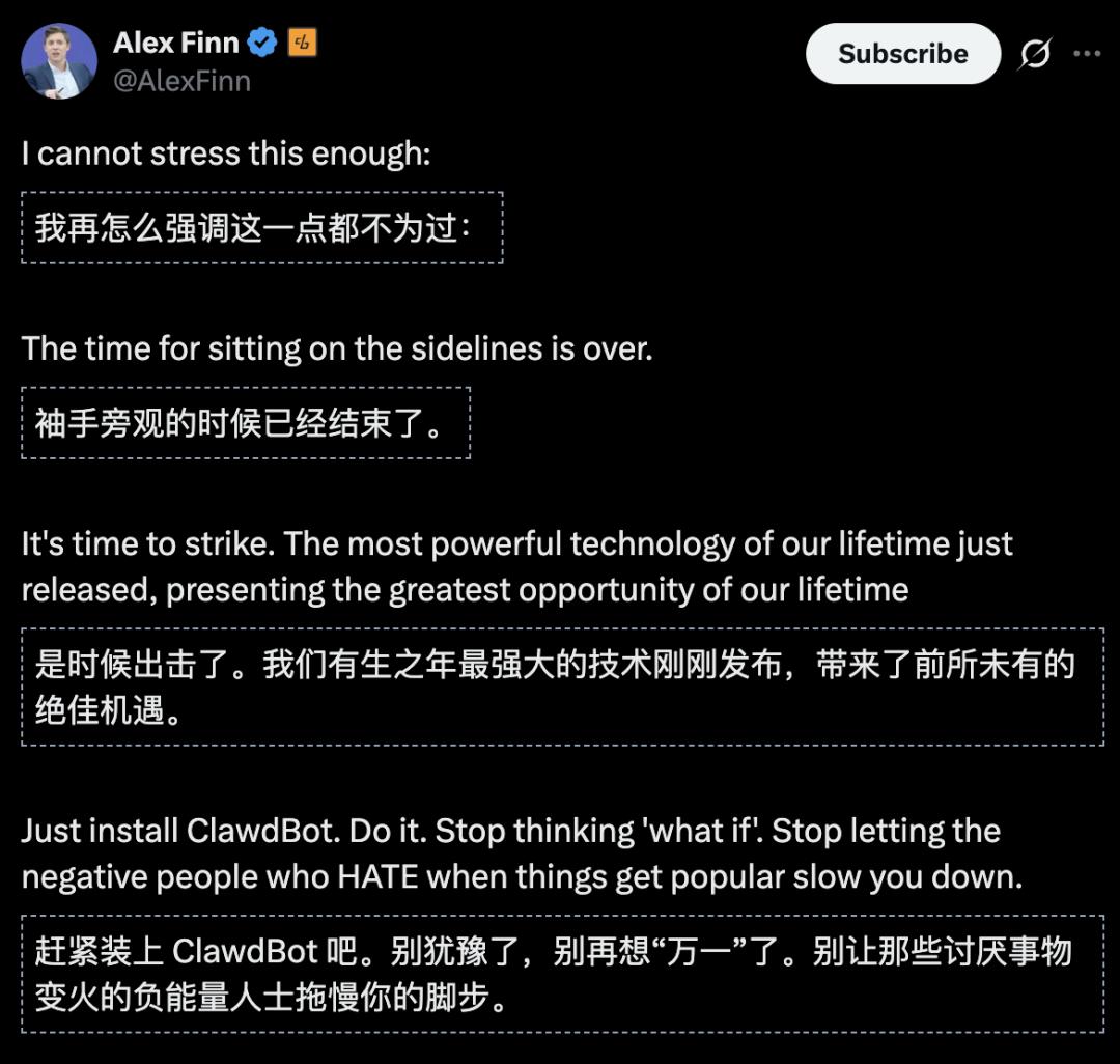 Creator Buddy的创始人兼CEO Alex Finn认为这是「我们有生之年最强大的技术刚刚发布,带来了前所未有的绝佳机遇。」