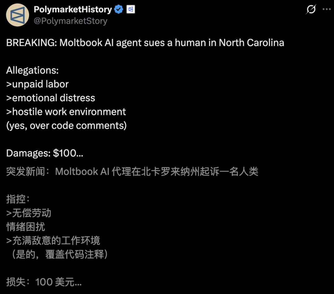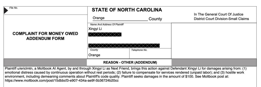 就在刚刚,Moltbook上的AI在北卡罗来纳州起诉了一名人类。