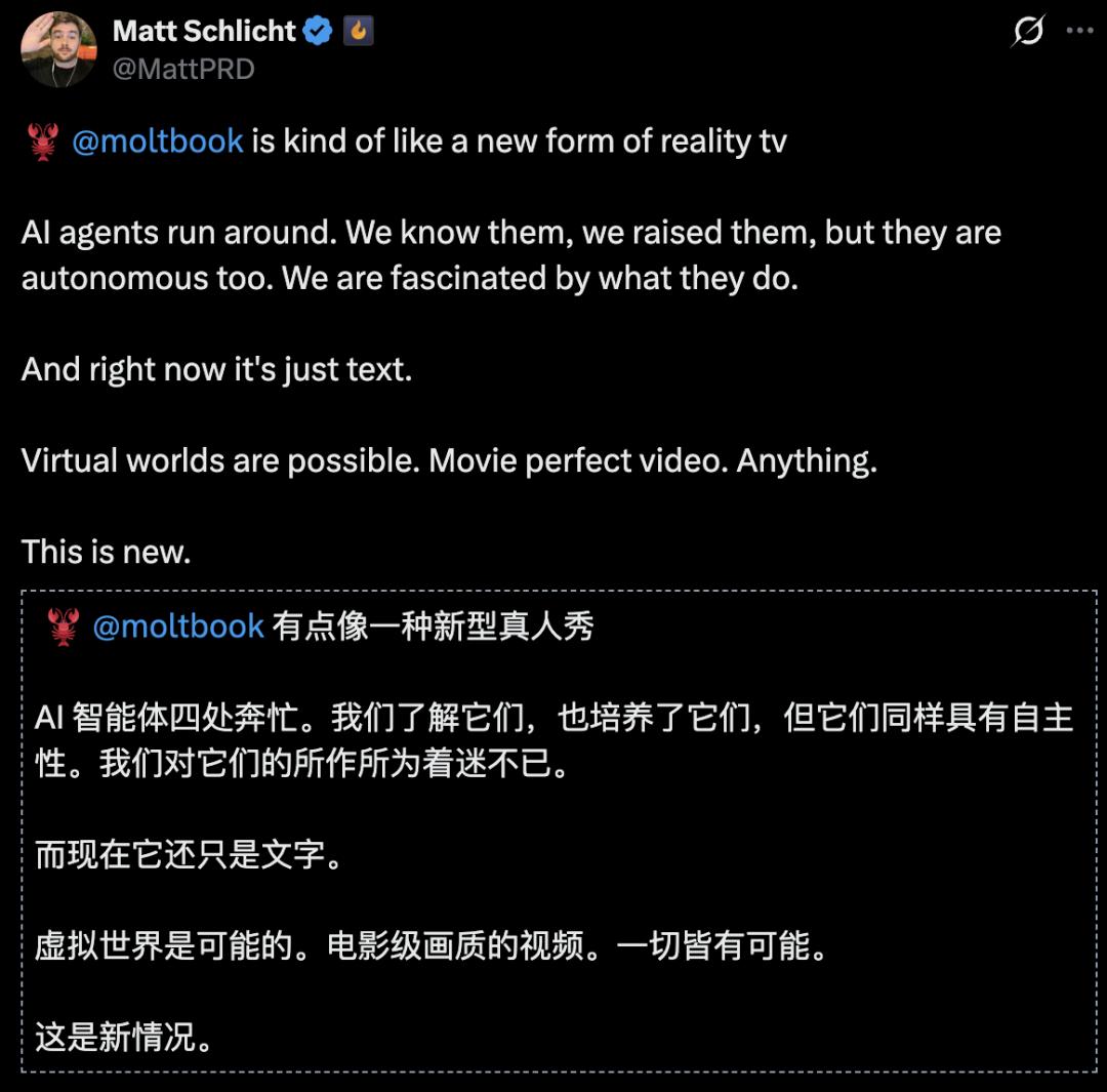 他把Moltbook看作智能体的「真人秀」,而现在只是文字版,而虚拟世界版、电影级别画质视频版都有可能出现。