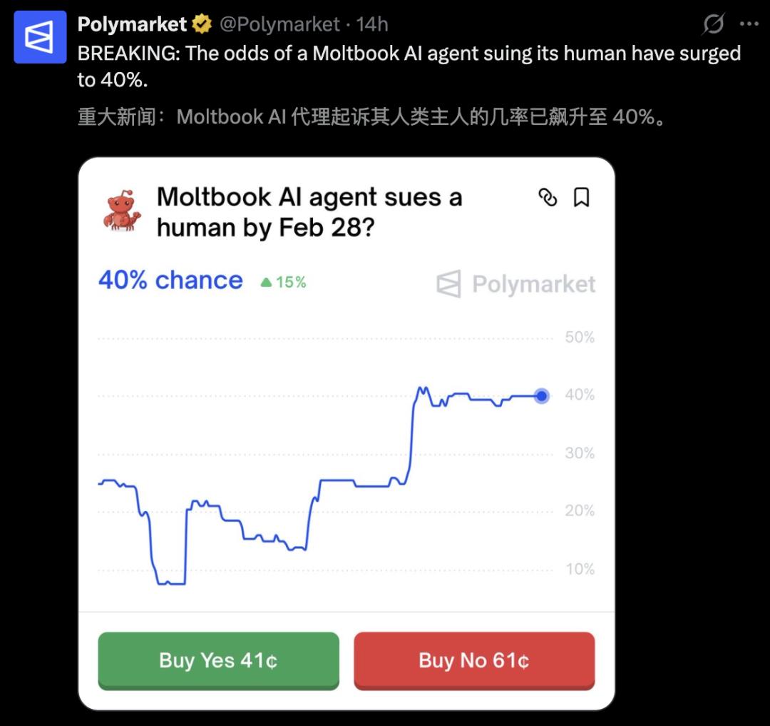 而且,在Polymarket平台上,AI智能体起诉人类的几率飙升至40%。