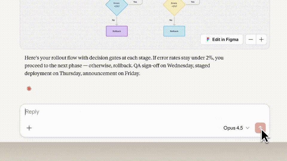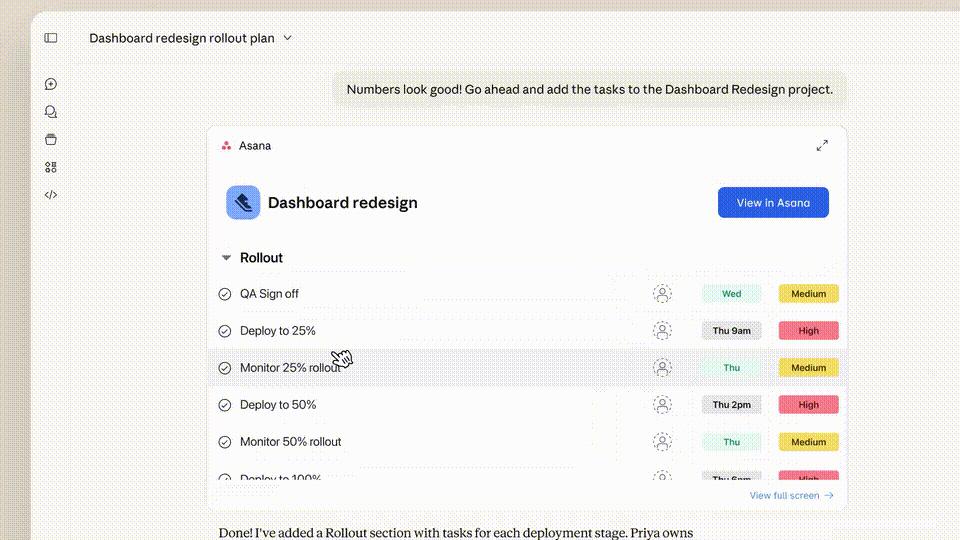 不论是起草Slack消息、将构思可视化为Figma图表,还是创建并查看Asana时间轴,一键完成操作。