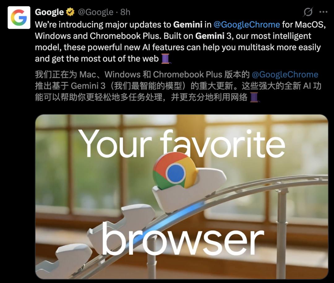 所有桌面端Chrome浏览器,正式接入Gemini 3。