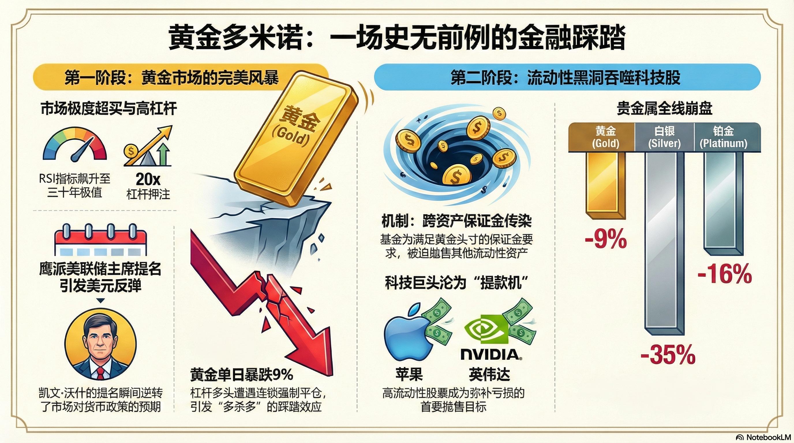 1)贵金属 1 月底的暴跌并非基本面的溃败,而是高杠杆多头的集体谢幕。2026 年初,过度超买的黄金在凯文·沃什入主联储的预期下闪崩,演变为吞噬一切的流动性黑洞。为弥补黄金头寸的巨额亏损,对冲基金被迫抛售流动性极佳的科技巨头,导致纳斯达克陪葬。