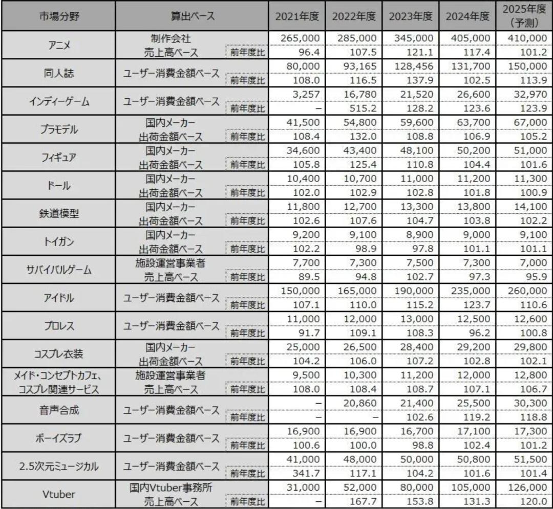 来看看这张图表,盘子最大的品类依旧是动画,2024年动画相关消费金额突破4050亿日元,同比增幅达17.4%。同时,报告预测2025年的增幅将大幅收窄至 1.23%,对日本这一传统优势领域的增长给出了相当悲观的预测。