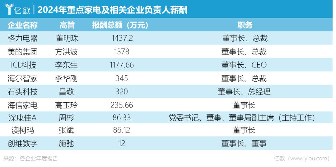 在薪酬上,美的也给予了方洪波“天价”回报。2024年美的年度报告显示,方洪波从公司获得的税前报酬总额高达1378万元。经亿欧查询,仅次于格力电器董事长董明珠(1437.2万元),其报酬总额在国内主要家电及强相关企业负责人中位居第二名。