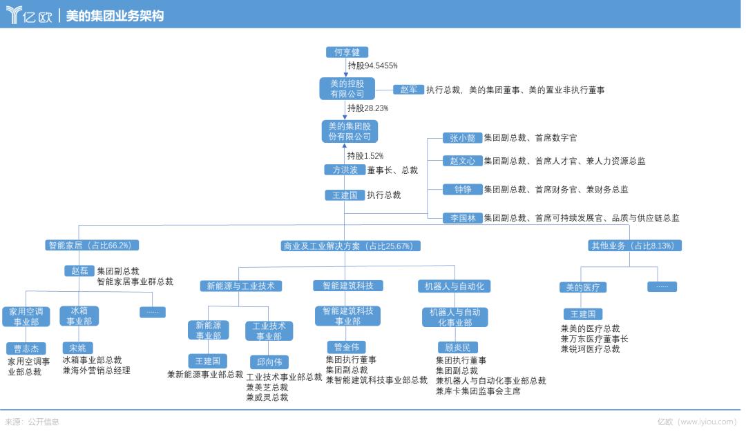 美的最早起源于1968年,历史上曾多次调整组织架构。根据官方信息,亿欧整理出美的业务架构和负责人对应关系(因信息滞后不排除存在偏差)。