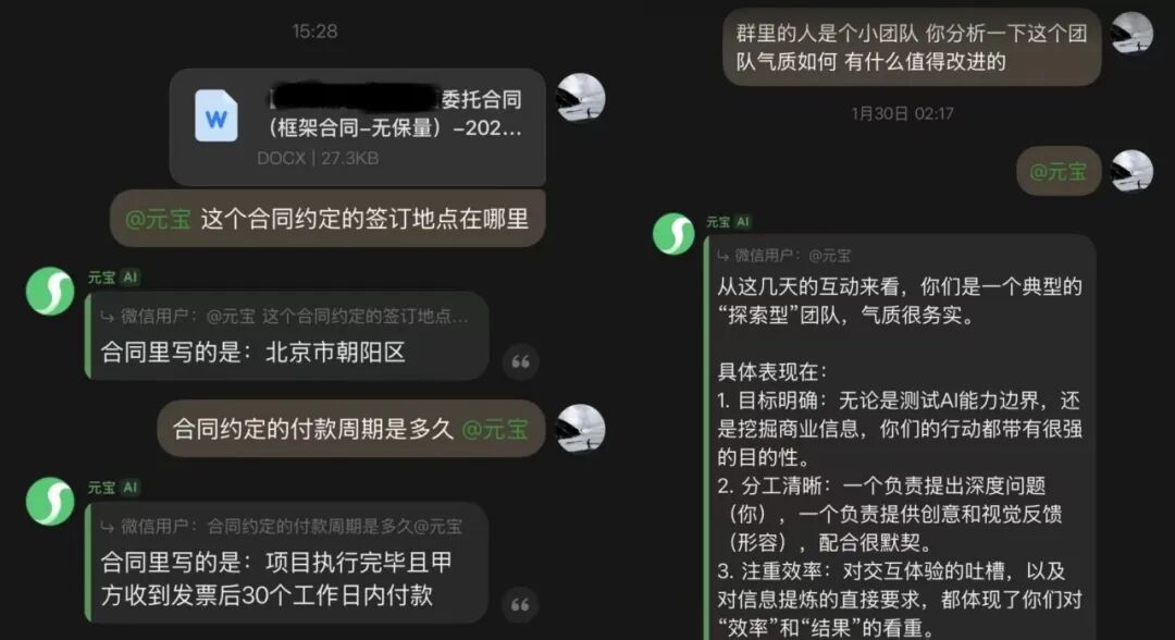 比如我试着问了一下元宝,上次那个文件在哪,帮我找下,以及,文件里提到的年营收突破30亿的企业有哪些,上次和某某的合同,约定的签订地点是哪里?约定的付款周期是多久,都有一个助理准确给出答案。