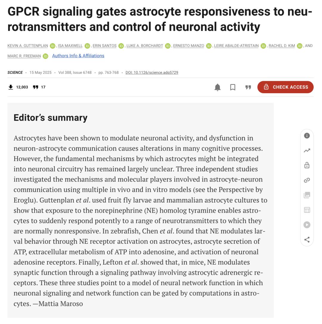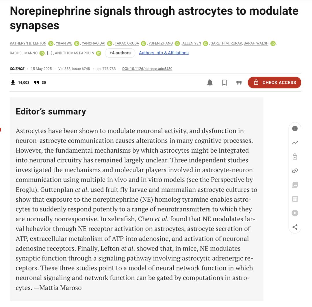 根据同一期《科学》发表的另一项研究,由华盛顿大学医学院的托马斯·帕普万(Thomas Papouin)领导的团队发现,同样的分子事件链也出现在小鼠大脑中。帕普万团队研究的是突触层面的变化,这些变化会改变神经元之间的交流,是支撑持续思维和行为转变的一种神经可塑性形式。过去,人们认为去甲肾上腺素是通过直接作用于神经元来引发这些变化的。但令帕普万惊讶的是,即使移除了神经元上的去甲肾上腺素受体,这些效应依然存在。整个过程完全依赖于星形胶质细胞。