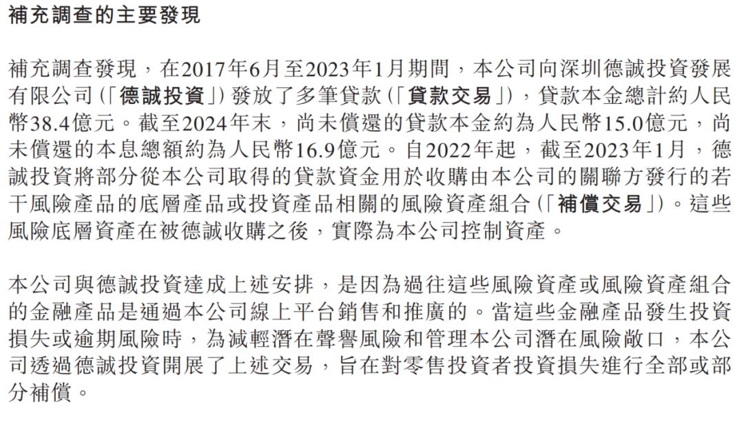 为什么这么做?陆控给出的理由是:因为公司线上平台曾面向零售投资者,进行过这类高风险资产或风险资产组合的销售与推广。当相关产品出现投资损失或逾期风险时,为减轻对公司声誉的影响,并控制风险敞口,便通过德诚投资开展了上述交易,旨在补偿受影响的零售投资者。