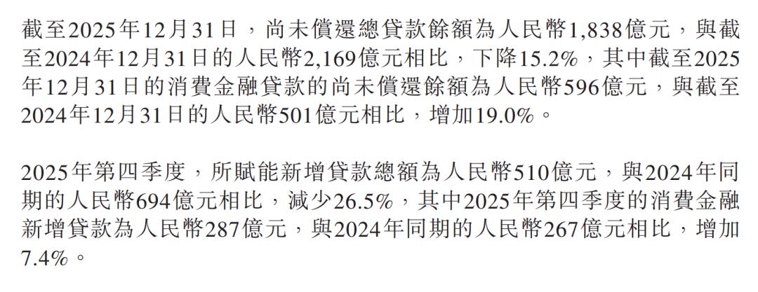 数据显示,截至2025年12月31日,公司累计借款人数2910万人,较上年同期增加12.5%;总贷款余额为1838亿元,较上年同期下降15.2%,其中,消费金融贷款余额为596亿元,同比增长19.0%。
