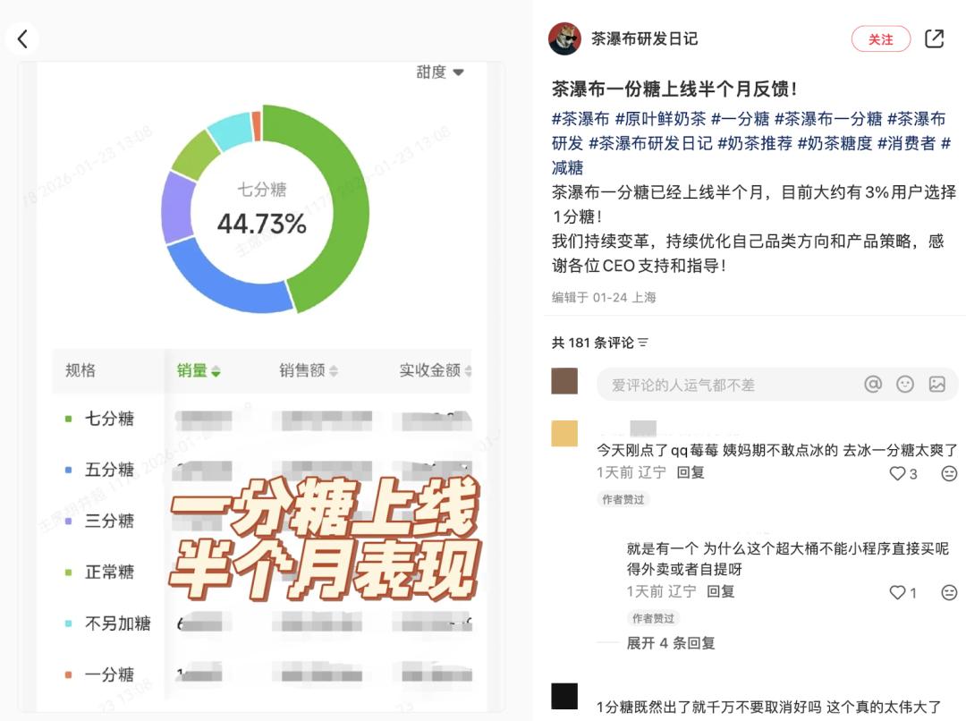 茶瀑布研发负责人胡井超告诉我,之所以在全国门店推行一分糖,是因为社交平台消费者反馈饮品太甜了。