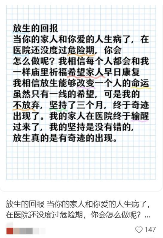 许多人笃信放生的人,聊起自己最初的动机,往往并不是求财、求事业。他们只是希望用自己的渺小善意,换来身患癌症的父母少些痛苦,或是ICU病房里的亲人能尽快醒来。
