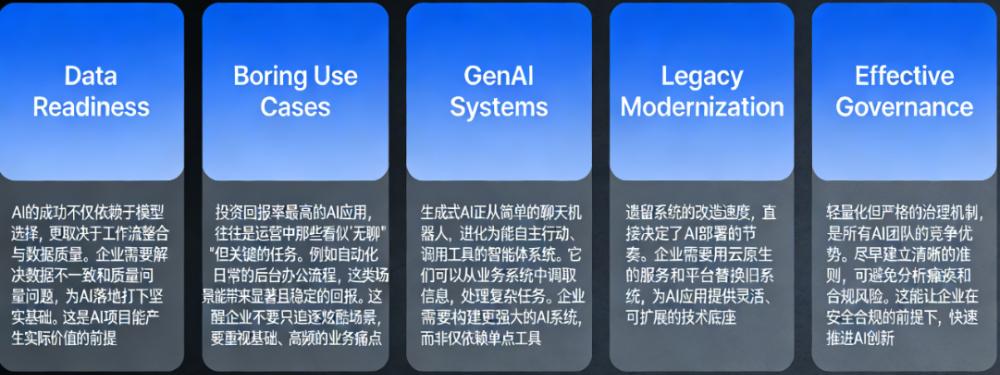这意味着要有强大的数据基础、明智的平台选择、有效的治理以及周全的变革管理。换句话说,执行力胜于实验。