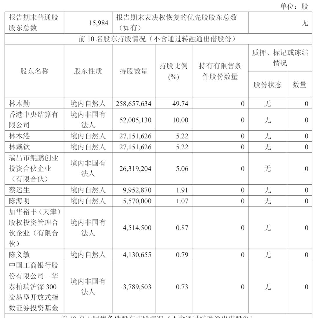 截至2025年9月30日,林木勤持股为49.74%,香港中央结算有限公司持股为10%,林木港、林戴钦分别持股为5.22%,瑞昌市鲲鹏创业投资合伙企业(有限合伙)持股为5.06%;