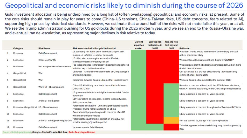 美国经济“金发姑娘”:特朗普政府在2026年中期选举年推动美国经济进入“金发姑娘”状态(高增长、低通胀),这将削弱对黄金的投资组合对冲需求。