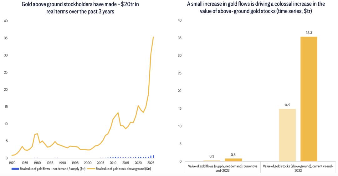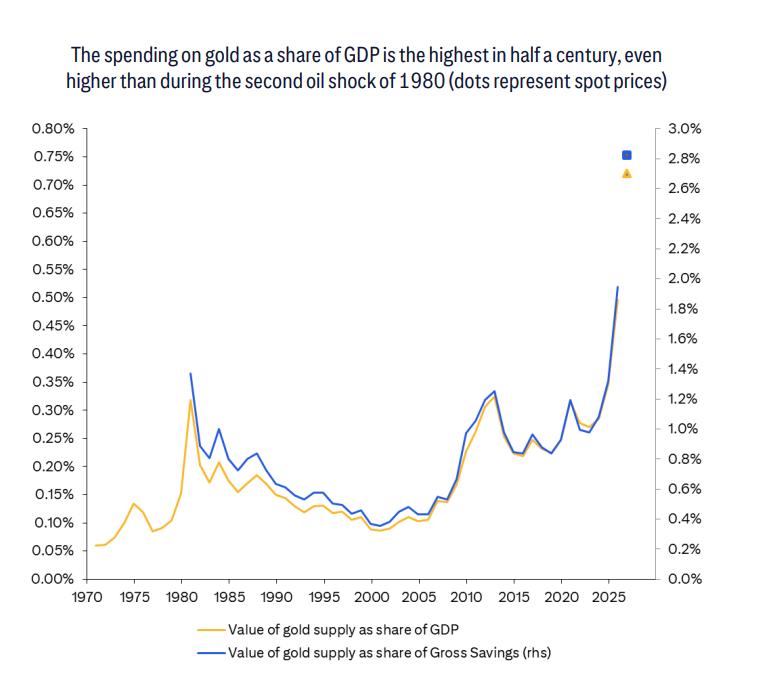 首先是与实体经济的脱钩:目前全球对黄金的年度支出占GDP比例已飙升至0.7%,这是过去55年来的最高水平,远超1980年石油危机时期。