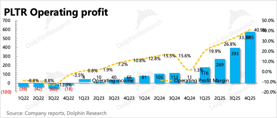四季度Palantir实现GAAP下经营利润5.75亿,三项经营费用中本季度销售费用、管理费用的增长有明显下降。最终带来GAAP下经营利润环比提高了7个点,达到41%,加回折旧和SBC后的经调整经营利润达到57%。
