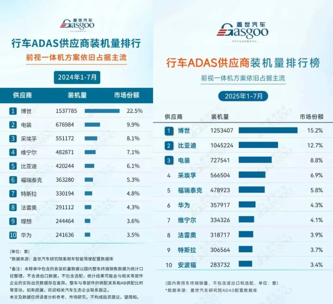 根据盖世汽车公布的2025年1—7月行车ADAS供应商装机量排行榜,博世在2025年1—7月装机量1253407套,市场份额15.2%。比亚迪紧随其后,同期装机量1045224套,市场份额12.7%。排名第三至第五的均为传统厂商电装、采埃孚、福瑞泰克,华为则排名第六,同期装机量357917套,市场份额4.3%。