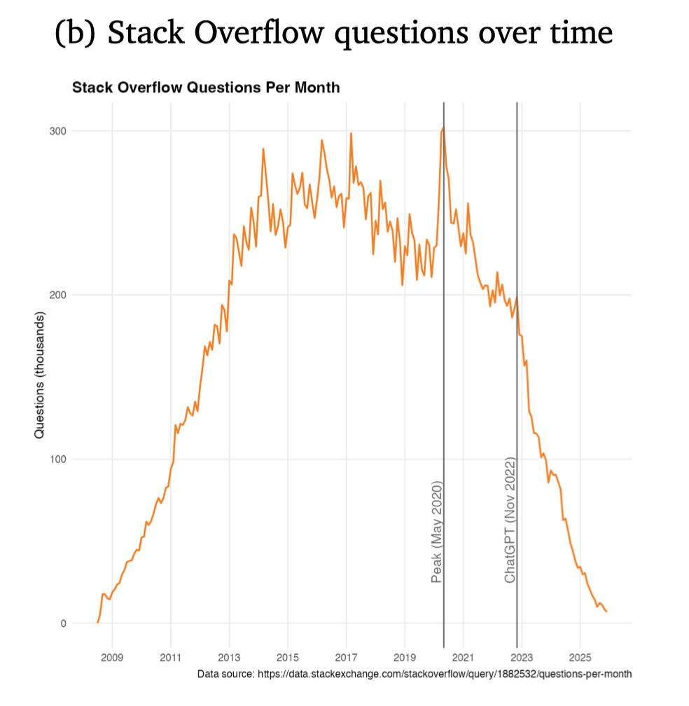比如,Stack Overflow 的公开问答流量,在生成式 AI 普及后出现明显下滑。很多原本会在公共社区被讨论的问题,被转移到了私有的 AI 对话中。