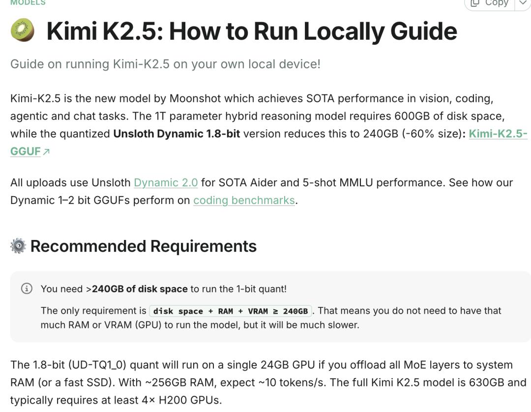 目前,Unsloth微调后的版本Kimi K2.5微调后大概是240GB的空间,用户的硬盘+内存+显存空间之和>240GB,可以初步运行这一版本的大模型。而完全版本的K2.5模型是630GB,且通常要求4块H200 GPU来运行——这一配置对于普通用户来说还是太贵了。