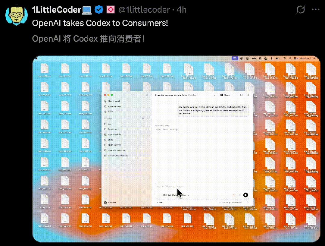 甚至,Codex还可与Claude Cowork狂飙能力,把杂乱桌面瞬间清理干净。