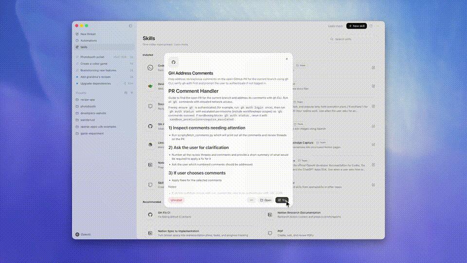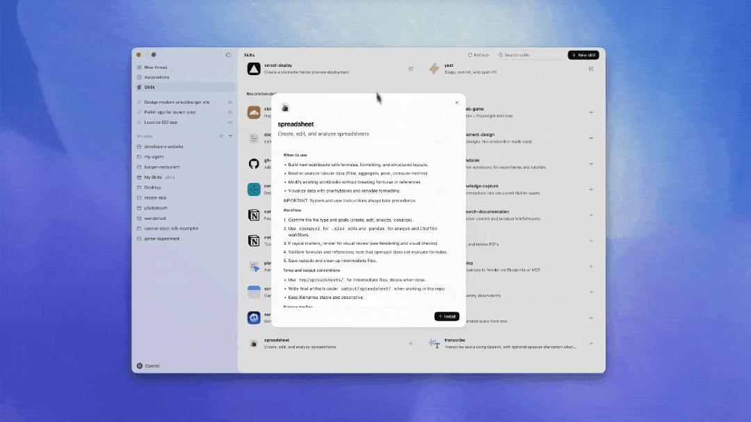 Codex应用内置了一个Skills库,涵盖了OpenAI内部流行的工具和工作流,下面重点介绍几个。