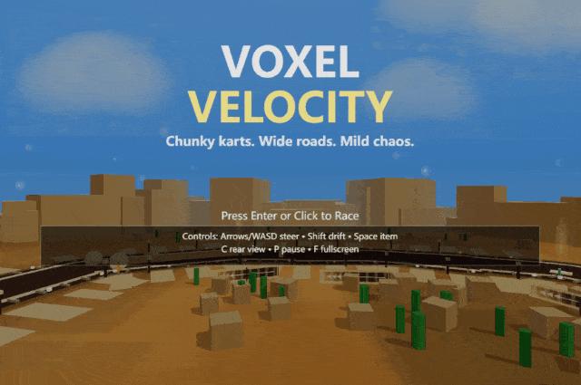 使用Three.js实现Voxel Velocity作为一个3D体素卡丁车赛车游戏,只有一种模式:单人比赛(总是3圈,1个人类对7个CPU,所有8条赛道立即在这个模式下可用,没有进度限制)。构建一个最小的赛前流程,仅包括:赛道(8),角色(8),难度(轻松/标准/刻薄),可选的镜像模式,可选的允许克隆,和开始比赛,加上一个选项菜单和一个赛中暂停菜单(恢复/重新开始/退出)。创建一个街机驾驶模型,具有灵敏的操控,宽容的擦墙碰撞,有意义的漂移作为主要技能,以及一个漂移充电系统,产生精确的加速等级(1级0.7秒,2级1.1秒,3级1.5秒),同时保持基准速度「快但可读」,并且在宽阔的道路上保持持续的超车。实现正好8个道具,单道具容量,微妙的位置加权分布,和温和的效果(最大失控≤1.2秒,最大转向禁用≤0.6秒),创造滑稽的混乱而没有硬眩晕,加上在加速期间减少50%的越野减速。定义8个角色及其给定的统计数据和AI倾向,实现CPU难度预设和赛道编写的赛车/变化样条线,漂移区和危险回避,以便AI使用多车道宽度进行干净的超车,并发布HUD/音频要素(位置,圈数/最后一圈横幅,小地图,道具槽,计时器/分段,可读的音效,和每个赛道一个音乐循环)。