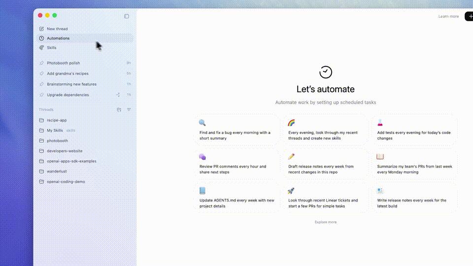Automations将指令与可选的Skills结合,会按照你设定的时间表运行。