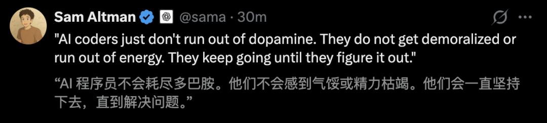 「AI程序员就是不会耗尽多巴胺。他们不会感到沮丧,也不会耗尽能量。它们会一直坚持下去,直到解决问题」。