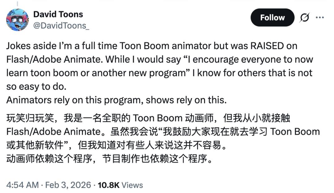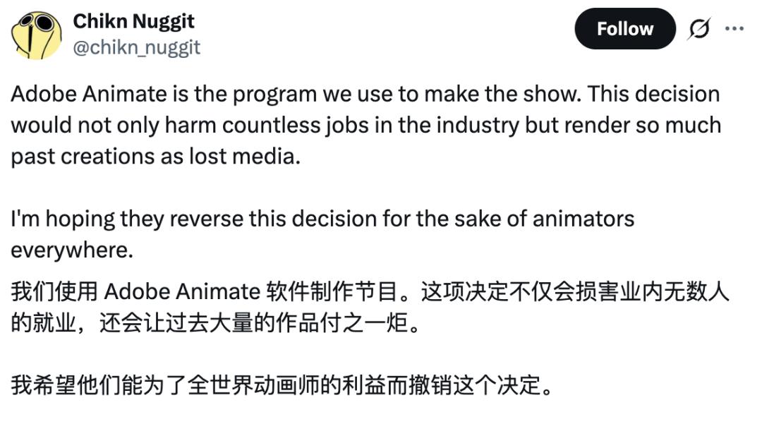 短篇动画系列《Chikn Nuggit》的创作者也发文,称他们至今仍在用Animate制作作品。