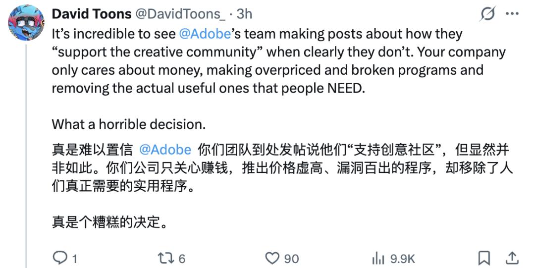 在他看来,这个决定极其不负责任。Adobe的做法不仅会影响无数从业者的正常工作,还可能影响大量既有作品的质量。