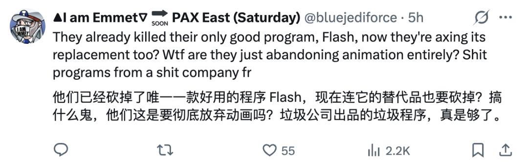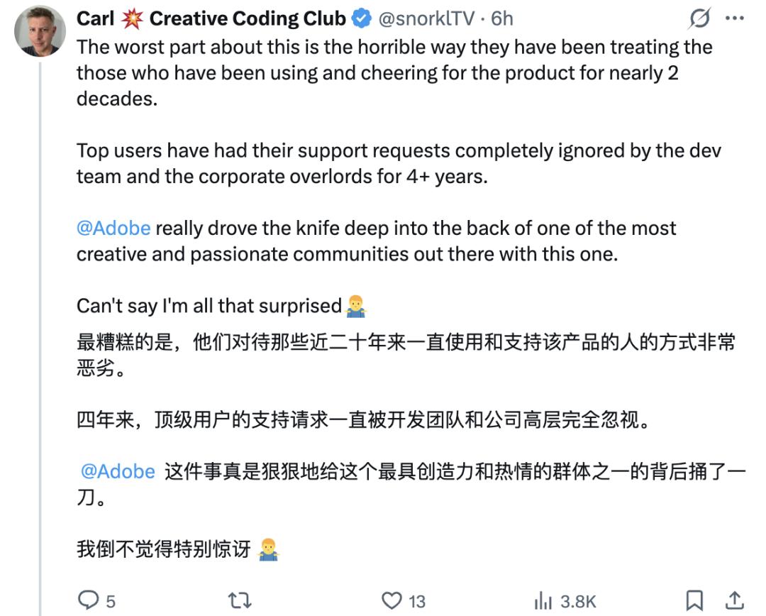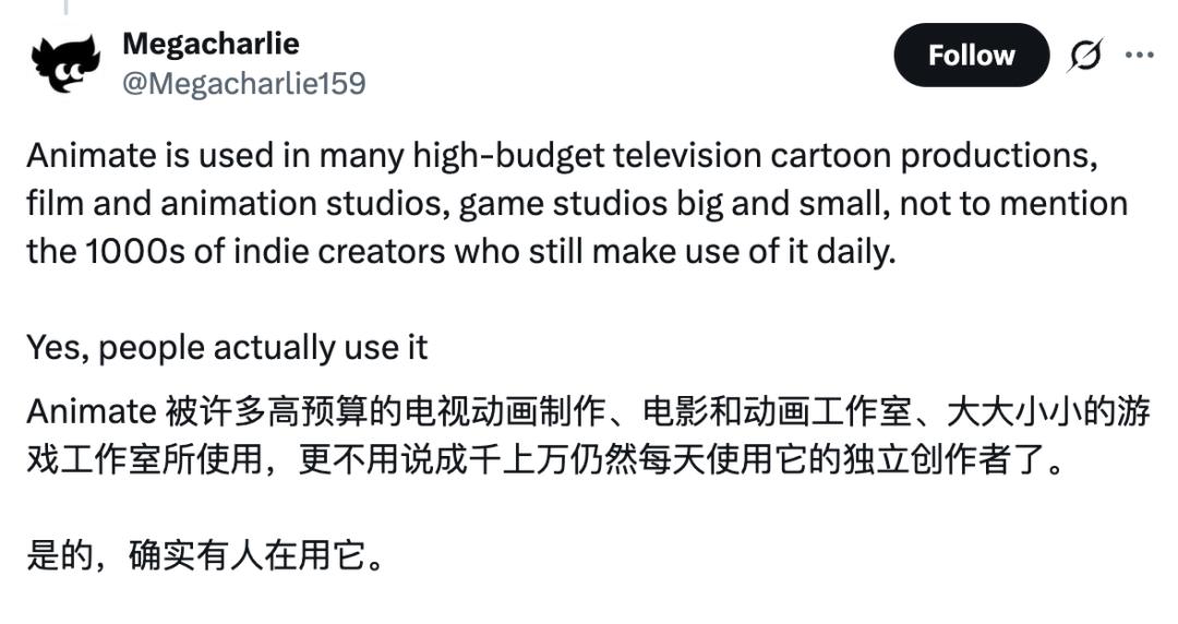 也有人早就心灰意冷,直言Adobe这些年对Animate用户的反馈一贯冷处理,如今被砍并不意外。