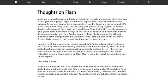 2010年,乔布斯甚至写了一封长达1700字的公开信,详细解释自己为什么讨厌Flash,并执意要和Adobe分道扬镳。