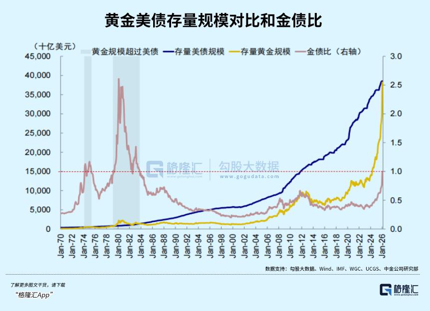 背后更关键的是美元信用在松动。当前全球黄金总价值(38.2万亿美元)快赶上美债规模(38.5万亿美元),这是80年代以来头一回。以前美元是老大,美债是硬通货,现在黄金能跟它平起平坐,说明大家对美元没那么信了——就像以前都认一家银行的存单,现在大家开始把钱换成黄金藏着,信号再明确不过了。