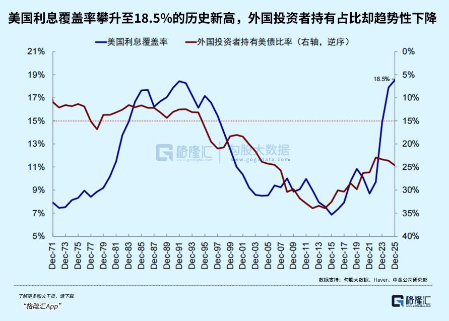 同时正如中金研究指出的目前美国陷入低通胀、低利率、美元霸权“三选二”的核心困境,无法同时实现三大目标。沃尔克曾以牺牲低利率为代价重塑美债信任,但如今美债存量(38.5万亿美元、占GDP122%)和利息覆盖比率(19.8%)远超1979年水平,该路径已难以复制。庞大的债务规模与高昂的付息压力,让美国重塑美债信任必须付出巨大代价,大幅加息这一历史手段已不具备可行性。