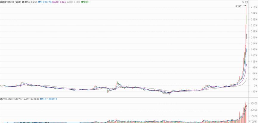 ——短短一个多月里,白银LOF涨到了最高5.247元,涨幅超过240%(下图)。