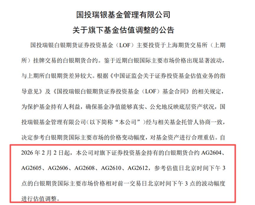国投瑞银基金公司于2月3日(实际上是2月2日晚间)公告宣布对白银LOF的“基金资产进行合理重估”。估值方法为:自2026年2月2日起,本公司对旗下证券投资基金持有的白银期货合约AG2604、AG2605、AG2606、AG2608、AG2610、AG2612,参考估值日北京时间下午3点的白银期货国际主要市场价格相对前一交易日北京时间下午3 点的波动幅度进行估值调整。