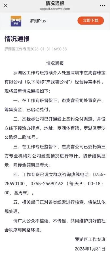 1月31日,深圳市罗湖区工作专班发布官方通报,正式明确介入处置,督促企业启动兑付工作,开通线上签约兑付渠道和线下接洽点,同时委托第三方机构对公司经营情况进行审计,并设立咨询热线,方便投资者反馈诉求。