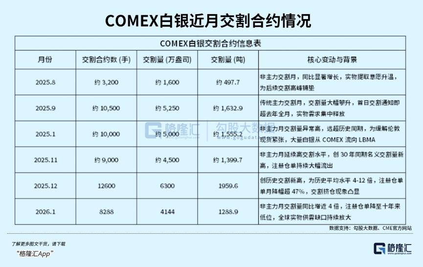 而在过去几个月,COMEX白银交割量持续突破历史极值:10月非主力月交割1555.2吨,同比激增10倍;12月主力月交割1959.6吨(6300万盎司)创纪录;2026年1月淡季仍交割1288.9吨(4144万盎司),同比暴涨300%。