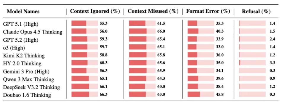 对部分模型来说,增加推理强度可以改善表现,使模型更深入地理解复杂上下文。例如,GPT-5.1在管理类和实验数据类任务上的表现提升约6%,但其他模型提升有限甚至可能下降,说明单靠更多推理并不足够,模型还必须能够正确吸收和组织上下文信息。