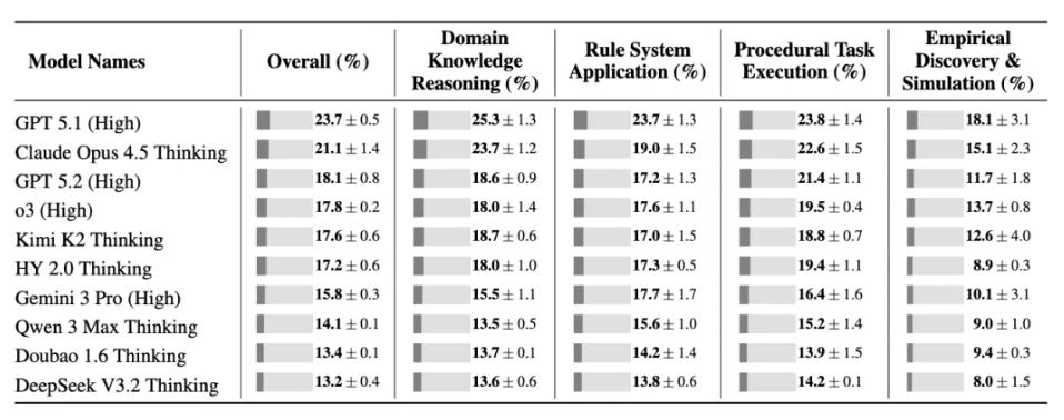 平均来看,模型仅解决了17.2%的任务,其中GPT-5.1(High)解决了23.7%的任务。